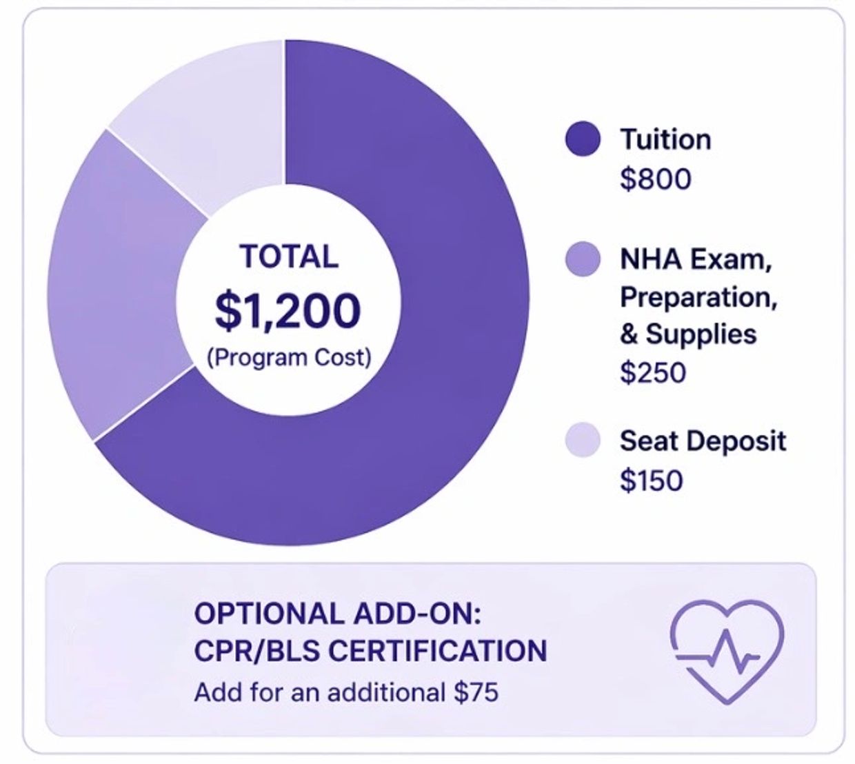 Our program offers transparent, all-inclusive pricing so you know exactly what to expect. The total cost is $1,200, which includes a $150 seat deposit, $800 for tuition and hands-on training, and $250 covering your NHA exam, exam preparation, and required supplies. CPR/BLS certification is available as an optional add-on for an additional $75 if needed. This structure ensures you’re fully prepared for certification without hidden fees.